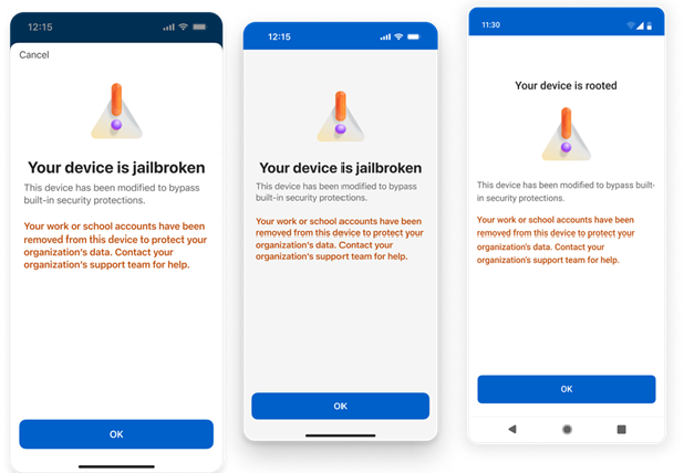 Users on jailbroken or rooted devices will receive in-app warnings when adding or using work/school accounts. This gives them time to act, such as removing the jailbreak/root or switching to a secure device.