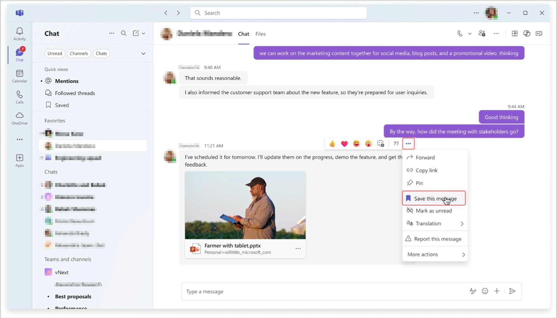 - Save a message: In any chat or channel, hover over the message (or long-press on mobile). Click the three-dot menu (…) and select Save this message.