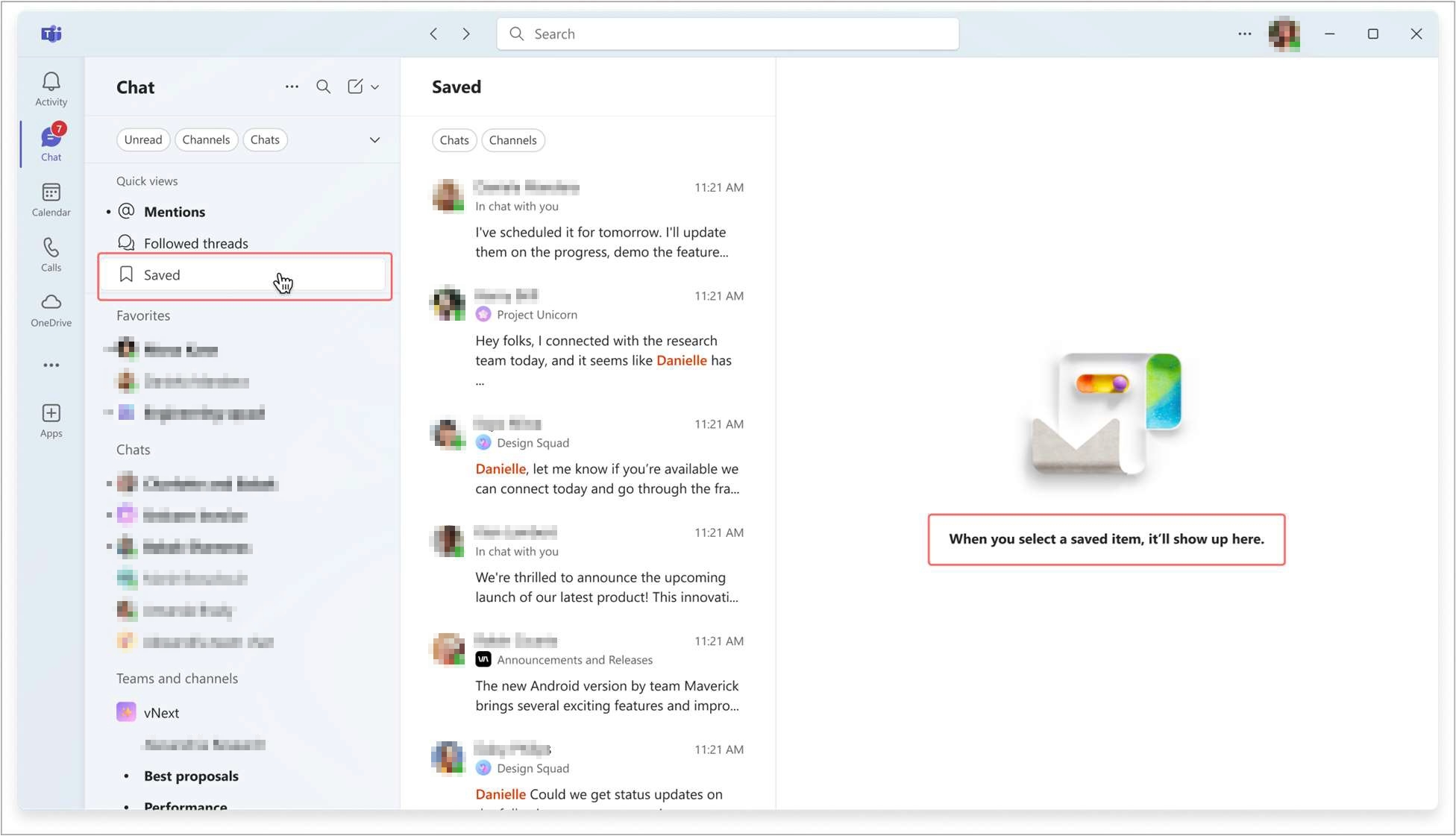 - Access saved messages: Navigate to the Chat or Teams list, then filter by Saved. You will see a unified view (in combined mode) or separate sections for chats and channels.